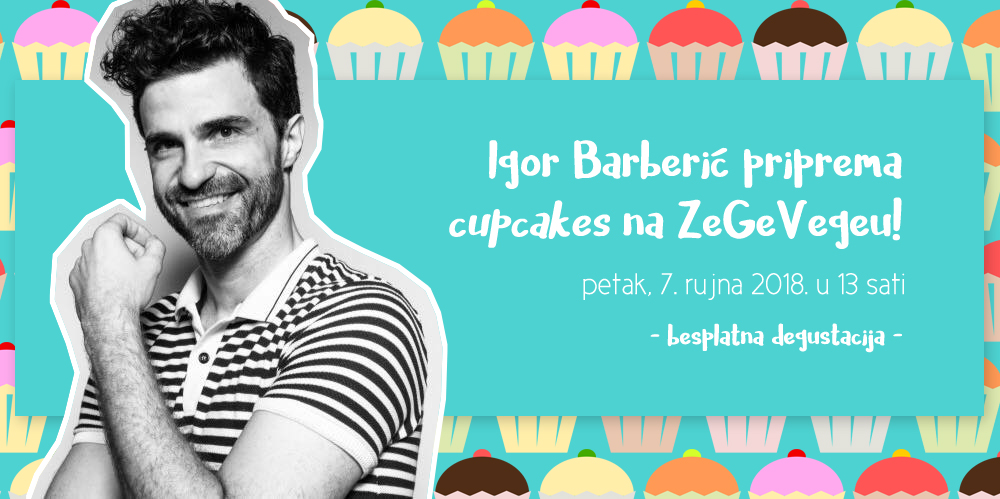 Ako ste među onima koji se pronalaze u izreci: „Na možeš kupiti sreću, ali možeš kupiti sastojke za cupcake, a to je gotovo ista stvar” i među onima kojima savršeni slatki kolač u papirnatoj košuljici ukrašen glazurom može izmamiti osmijeh i u najcrnjim danima, nemojte propustiti priliku posjetiti ZeGeVege festival 7. i 8. rujna 2018. na zagrebačkome Trgu bana Jelačića. Igor Barberić, poznati koreograf, redatelj i stalno lice ekipe „Tvoje lice zvuči poznato”, zamutit će 7. rujna u 13 sati čak tri veganske varijante popularnih cupcakes.