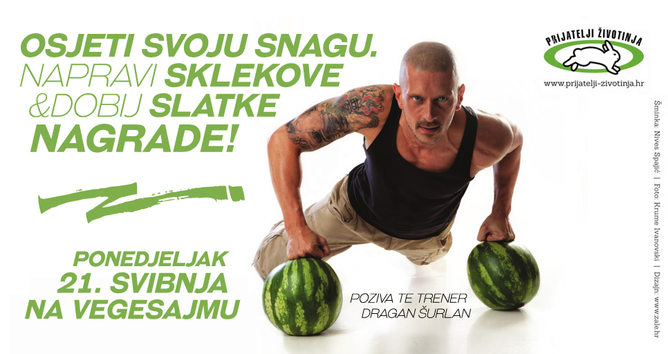 Dragan Šurlan, trener fitnessa i psiholog, utemeljitelj programa Fitness Bootcamp u Hrvatskoj, vegan i promotor zdravih navika te jedan od onih čiji su mišići izgrađeni od biljnih bjelančevina i čija snaga dolazi iz suosjećanja, poziva sve da u ponedjeljak 21. svibnja 2018., od 8 do 19 sati na zagrebačkome Trgu bana Jelčića, posjete 7. VegeSajam.