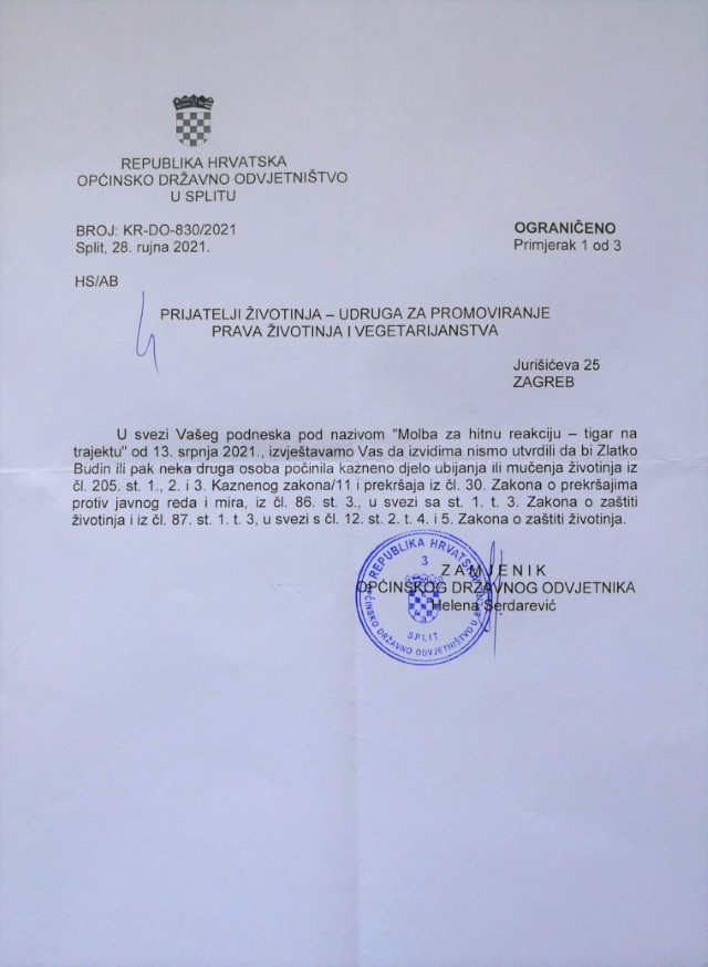 Odgovor zaprimljen 28. rujna 2021. godine od Državnog odvjetništva