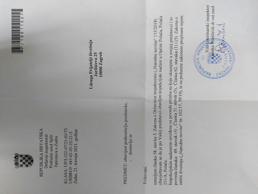Slijedom navedenoga, molimo Vas da učinite inspekcijski nadzor u Općini Polača te utvrdite gdje se nalaze predmetne životinje koje je komunalni redar Zvonimir Perajić, kršeći Zakon, preuzeo 17. veljače 2021. s adrese Gornja Jagodnja 5, Polača.
