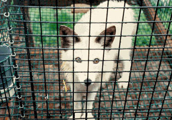 "Even death doesn't come easy on a fur farm! No humane slaughter laws, so farmers use hideous killing methods that don't damage the animals' pelts but cause excruciating pain. Small animals are killed in makeshift boxes pumped with hot/unfiltered engine exhaust. They may be still alive when the hose is turned off, and wake up while being skinned! They may be killed by anal electrocution (insertion of a red-hot metal rod into the anus), in decompression chambers or by breaking their neck bones!" (Quoted in The Animals' Agenda)