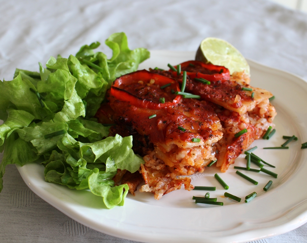 Uliti u posudu sok od rajčice i dodati isto toliko vode. U to ubaciti pola žličice papra, soli, malo kurkume, pola žličice dimljene paprike, malo ljute paprike, malo obične crvene paprike i žličicu origana. Nasjeckati luk i kratko ga prepržiti. Oguliti i narezati krumpir na tanke ploške širine oko 2 mm. Namazati dno keramičke posude uljem, preko toga poslagati prvi red ploški krumpira pa dodati preprženi luk i zaliti prethodno pripremljenom smjesom od soka rajčice. Na to dodati rižu pa onda sve ponavljati red po red, dok svega ne ponestane. Staviti poklopljeni složenac u prethodno zagrijanu pećnicu, na najdonji dio pećnice. Peći oko 45 minuta na 250 °C , a onda otklopiti pa bocnuti vilicom i vidjeti je li krumpir omekšao i treba li nadoliti tekućine. Ponovo poklopiti i nastaviti peći još dodatnih pola sata. Nakon toga otklopiti i pustiti da se sve zapeče.