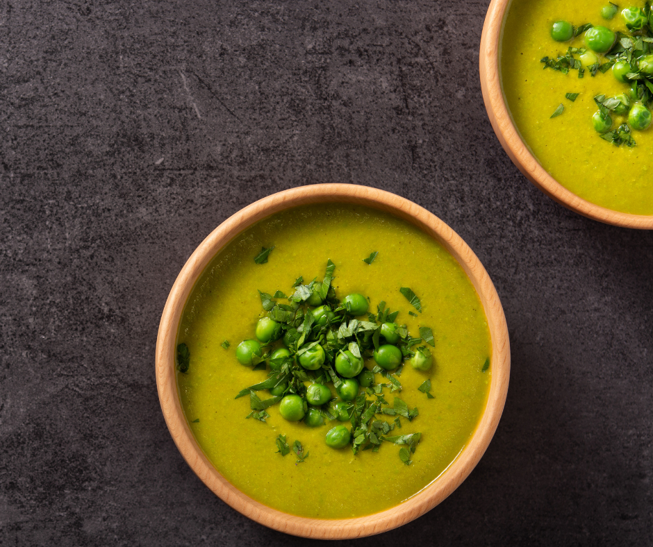 Oljuštiti češnjak. Pristaviti u litri vode svježi ili zamrznuti grašak (konzervirani dodati kad se skuha drugo povrće), češnjak, luk, probrani špinat, oguljene narezane krumpire i poriluk. Dodati oprani peršin (sačuvati nekoliko listića za ukras), posoliti, popapriti i kuhati da sve omekša. Neka se ohladi. Polovice oraha narezati. U mlaku juhu dodati ocijeđeni grašak iz konzerve i samljeveni orah. Zatim povrće i juhu smiksati u kašu. Juhu po želji razrijediti sojinim mlijekom, pa prokuhati i naposljetku umiješati margarin. Ukrasiti nasjeckanim orasima i peršinovim listićima.
