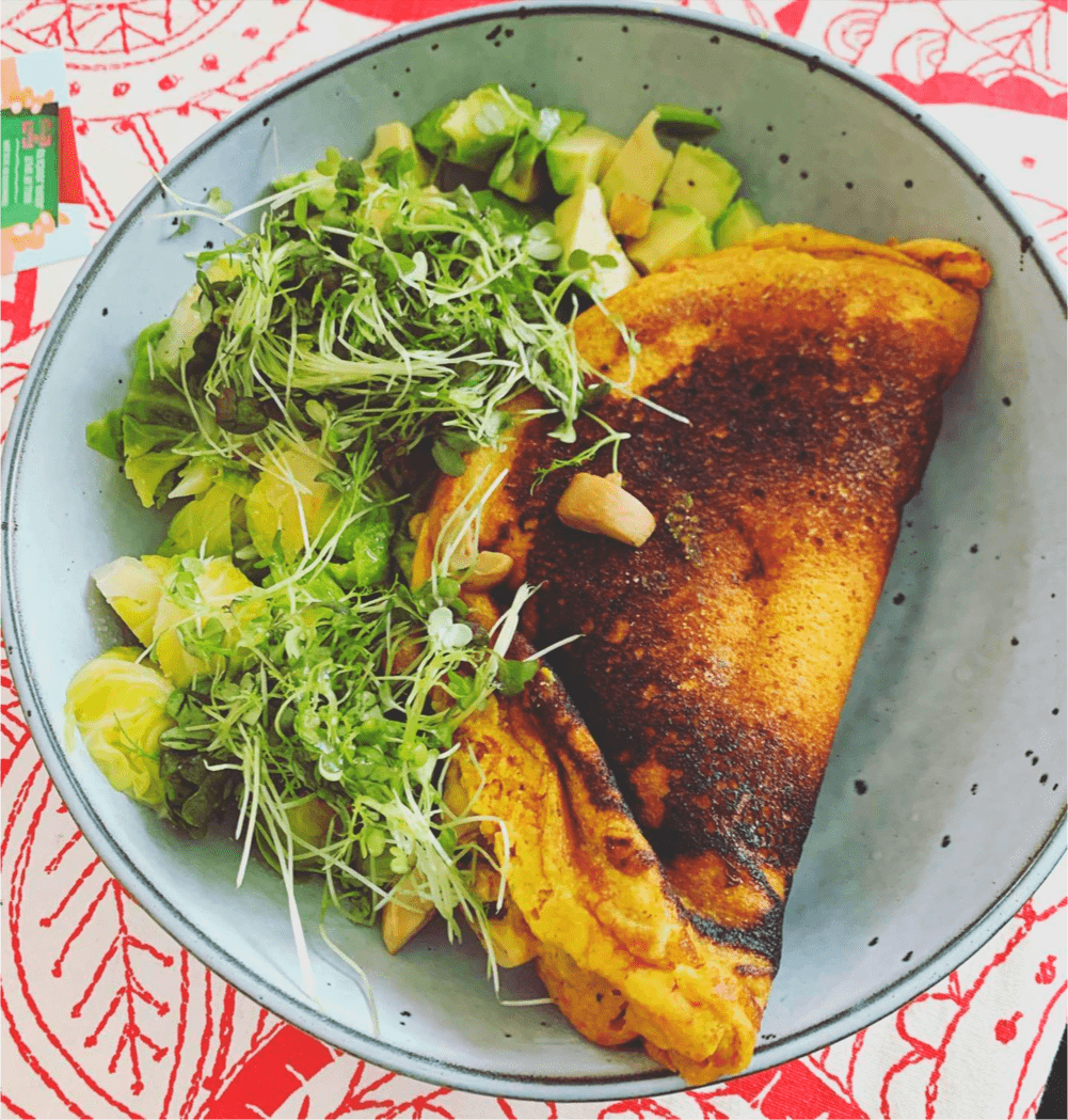 Sve sastojke za smjesu od slanutka izmiješati tako da gustoća bude kao za palačinke pa ostaviti kratko da odstoji. Povrće pirjati. U zagrijanu tavu s malo maslinova ulja uliti pola smjese, a povrće rasporediti po jednoj polovici. Kada se počnu stvarati mjehurići, omlet preklopiti, pokriti tavu i ostaviti da se peče još 4 do 5 minuta