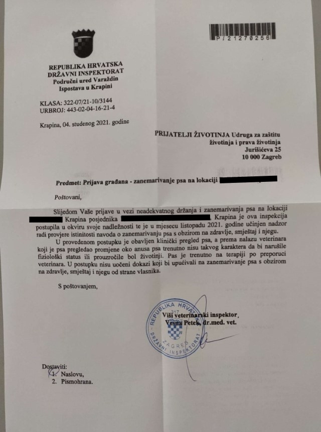 Odgovor veterinarske inspekcije zaprimljen 4. studenog 2021.: